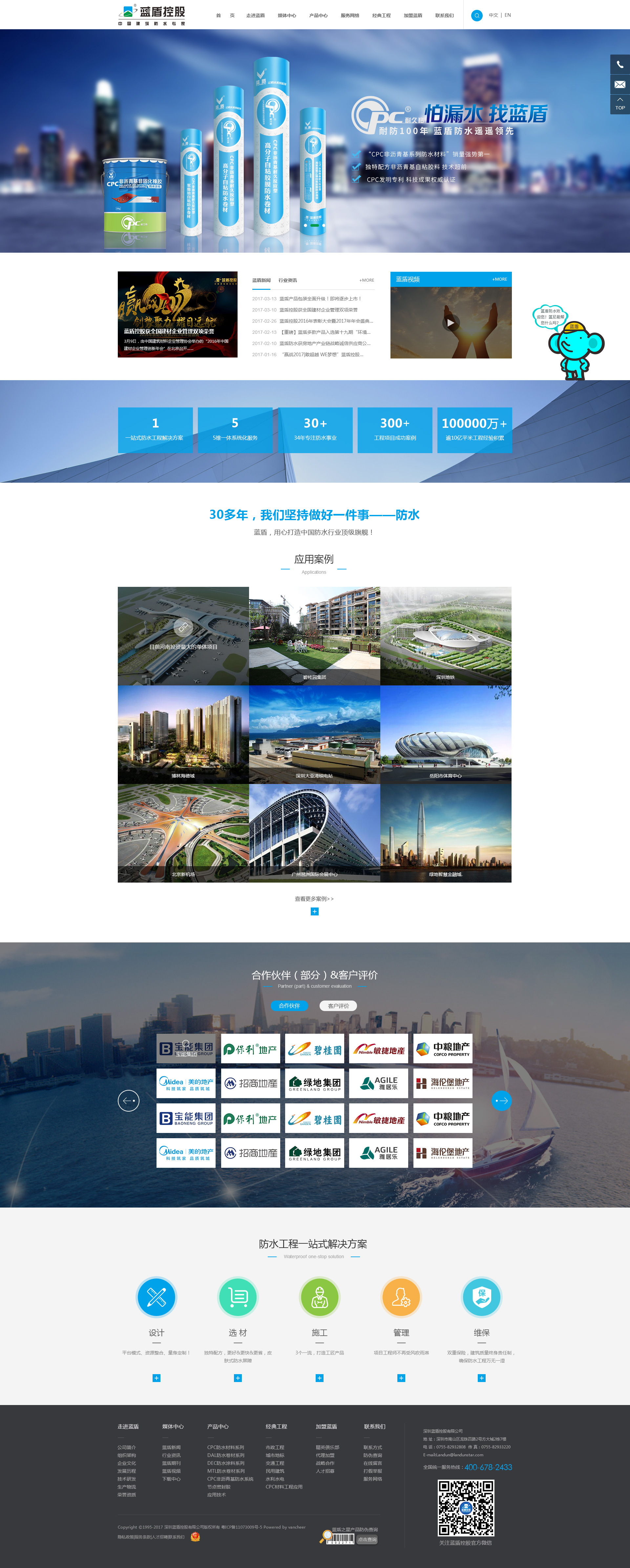 深圳藍(lán)盾控股有限公司起源于1983年,現(xiàn)已發(fā)展成為集防水工程設(shè)計、防水材料研發(fā)及生產(chǎn)、施工管理和維保于一體的專業(yè)化防水系統(tǒng)運營服務(wù)商。公司持有建筑防水防腐保溫工程專項承包高資質(zhì)。 深圳藍(lán)盾控股旗下?lián)碛猩钲谑兴{(lán)盾防水工程有限公司、深圳市藍(lán)盾防水構(gòu)造技術(shù)有限公司、深圳藍(lán)盾之星科技有限公司、湖北藍(lán)盾之星科技有限公司、廣東藍(lán)盾之星科技有限公司及深圳前海藍(lán)尼防水技術(shù)有限公司。公司已在全國主要省會城市分別設(shè)立了500余地市級經(jīng)銷商服務(wù)網(wǎng)點、36個省級營銷中心,9個重點城市辦事處。產(chǎn)品和服務(wù)遍布全國并惠及海外,能為各類市政工程、城市地標(biāo)、交通工程、民用建筑、水利水電等項目提供“設(shè)計、材料、施工、管理、維保”一站式防水工程解決方案。