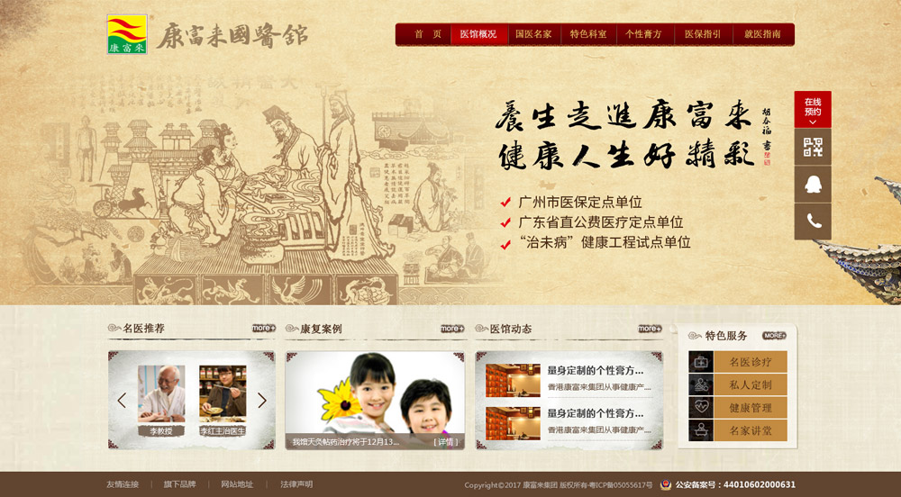 香港康富來集團從事健康產(chǎn)業(yè)五十年,是國內(nèi)知名企業(yè)??蹈粊韲t(yī)館是康富來集團投資興辦的一南中國具特色的中醫(yī)醫(yī)療機構(gòu),為廣東省衛(wèi)生廳授牌的“治未病健康工程試點單位”、廣州市醫(yī)保定點單位、廣東省直公費醫(yī)療定點單位、廣東省中醫(yī)藥學會名醫(yī)會診中心、廣東省亞健康科普教育基地。