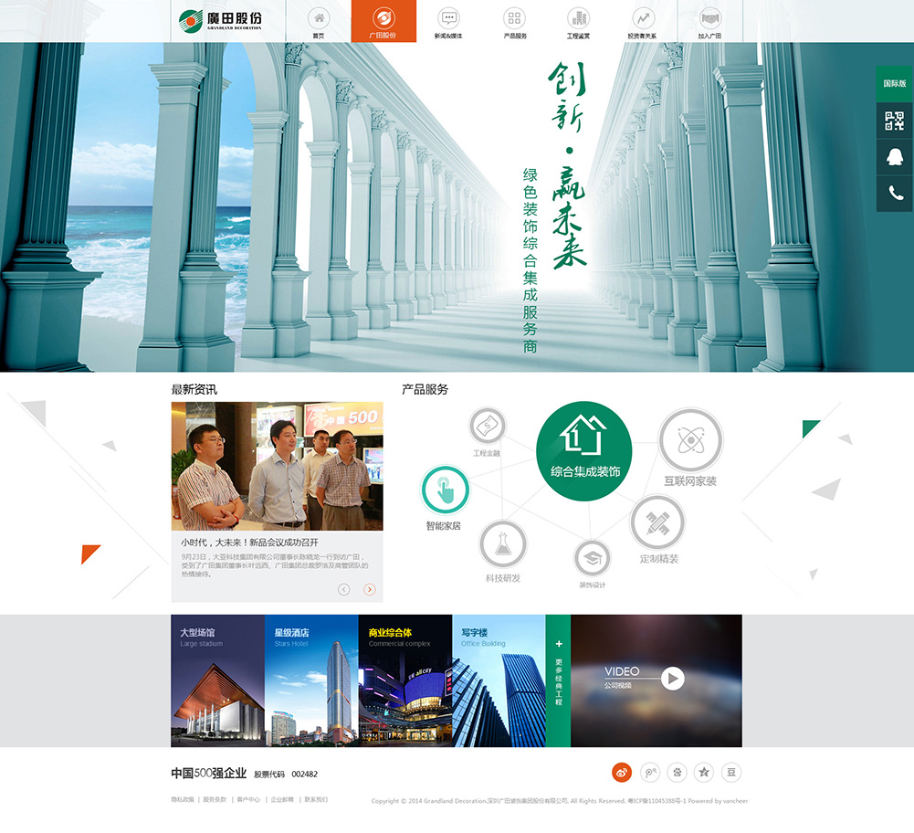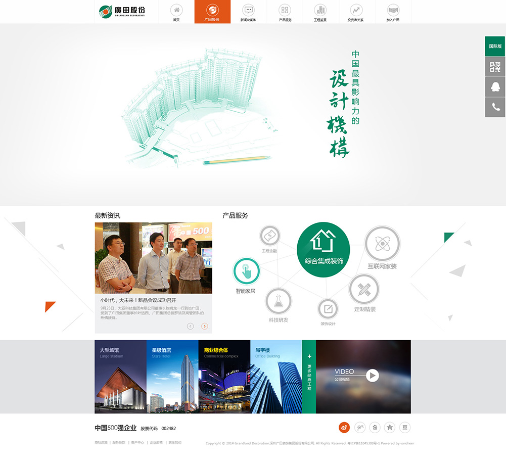 廣田集團(tuán)成立于1995年,是一以建筑裝飾設(shè)計(jì)與施工,綠色建材研發(fā)與生產(chǎn)為主體的專業(yè)化、綜合性上市集團(tuán)企業(yè)(股票代碼:002482)。公司連續(xù)兩年榮膺《財(cái)富》中國500強(qiáng)企業(yè),是高新技術(shù)企業(yè)、守合同重信用企業(yè)